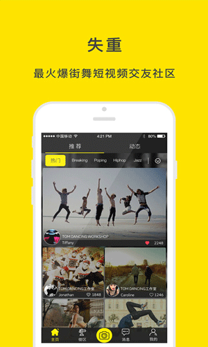 失重街舞社区,一款专为街舞爱好者打造的视频分享软件,失重街舞社区包含各种街舞视频分类,用户可通过失重街舞社区随时随地拍摄分享自己的街舞视频,来失重街舞社区尽情展示自己,让更多的人认识你。