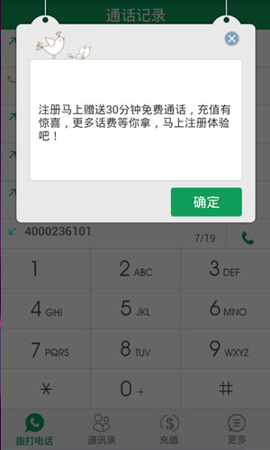 省钱电话软件特点: 1、用户首次注册就送30分钟免费通话。 2、超低的资费让你分秒都省。 3、充值大优惠,来显,VIP客户多种礼包相送。 4、便捷的服务让你迅速找到电话号码。 5、还可以邀请好友一起参加获得高昂的话费。