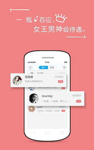 漂流瓶子是一款非常新颖且有趣的社交软件,通过瓶子,将要说的话送向远方,与陌生人天南地北随你畅聊。当你内心憋屈想吐槽的时候,当你有心事的时候,当你想要骂人爆粗的时候,瓶子是你不错的选择,反正没人会知道你是谁! 漂流瓶子软件特色 1.扔瓶子,讲心事,缘分天定; 2.通过游戏,认识各地陌生人; 3.图片、语音、文字,随你玩; 4.高富帅、白富美,能遇到吗? 漂流瓶子2.2.0版本更新内容 1.【新增】好友拉黑名单功能; 2.【新增】新年活动大礼包; 3.【修复】上一版本的bug。
