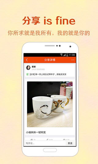 Fine,一个朋友之间相互分享购物心得的社交平台。在这里,分享是一种态度,是朋友间表达友谊的一种方式。无论你是买了什么商品,都可以通过Fine,分享给好友,并说出自己的购物体验。 Fine0.9.7版本更新内容 1.【新增】积分功能,可参与奖品兑换; 2.【新增】QQ、微博等第三方登录入口; 3.【新增】滤镜功能,上传更美的图片; 4.【优化】用户体验及界面显示; 5.【修复】上一版本出现的已知bug。