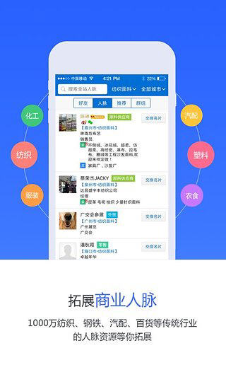 人脉通升级版1.6.3.1的特色: 1.万家商铺,数千万商品任用户选购; 2.百万商务精英在线交流; 3.详细的会展信息和供应商信息;