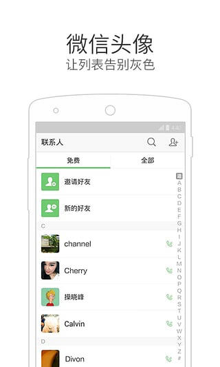 微信电话本免费通话软件特色: 完全免费的高清通话体验; 多人一起群组进行畅聊; 自动匹配微信头像; 远离骚扰电话打扰; 轻松备份联系人;