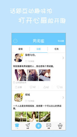 男闺蜜是一款新型的交友购物软件。每个女生都渴望有一个了解自己、能和自己一起分享快乐悲伤、无话不谈的男闺蜜,那么就来注册吧,秒变女神,找到属于你的男闺蜜!
