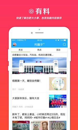 兜圈子app应用特色: 1.面向合肥本地85后及90后群体。 2.以兴趣圈子社交互动、合肥新鲜事爆料、实用生活攻略查询为定位。 3.用户可定制喜欢的个性化内容。倡导全新的、年轻的生活理念。