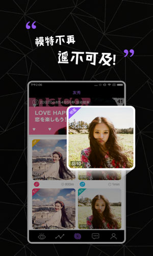 友秀软件特色: 1.友秀汇集了百万名年龄18-28岁左右的时尚女生、知名模特、网红。 2.友秀准确分享传播,用品牌赛事选秀、时尚高端派对、人气网红明星炒作等方式。 3.友秀以艺人为基础,品牌为动力,平台为承载,参与式传播为核心,结合平台首创分享秀、到店秀、派对秀、赛事秀、明星秀,通告秀6大功能。