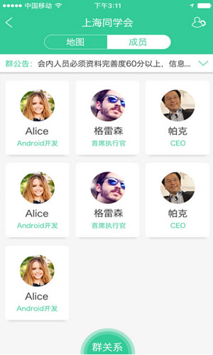 对上app软件特色: 1.对上app是一个商业的社交网络软件,为商业的用户提供专业的交流平台。 2.在对上app,当新进的好友填写完资料后,用户就能发现与好友之间的商业关系链,就此发现更多潜在的价值。 3.对上app还可以进行线下商务会议、展会及活动中,用户可以创建一个群并分享链接给现场其他用户,当现场其他用户也加入后,用户可以快速的与现场的其他用户建立价值链,匹配各自的商业价值。