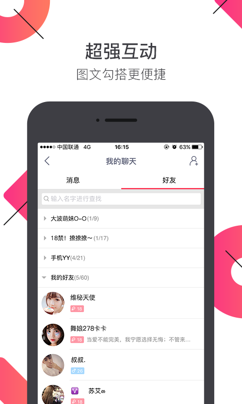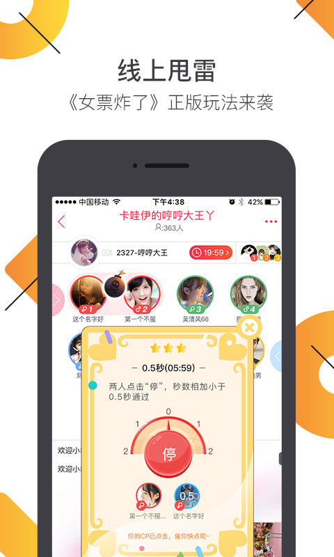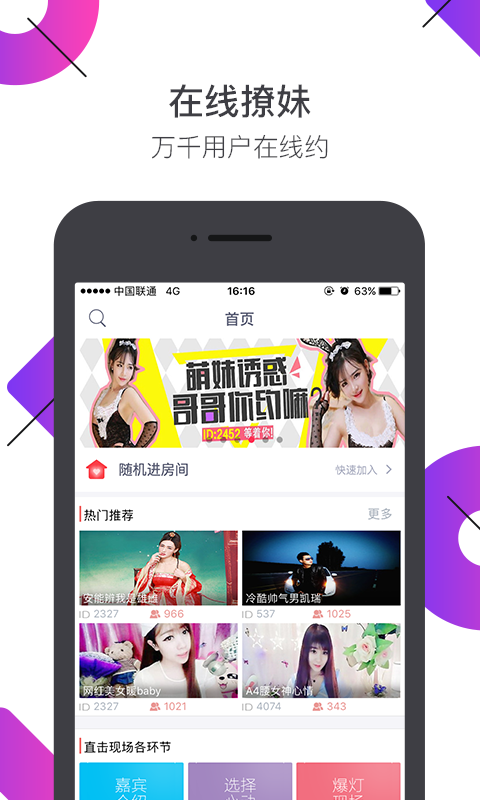 YY相亲交友app是一款时语音交友平台,这款软件使用和非诚勿扰类似,如果男女双方互选为心动对象,就会出现炫彩爆灯画面。这里有上千名知名主持,在现场亲自带你交友;pc交友数据完全互通,在线约会一路畅通;这里也有万人在线约会,总能让你找到合适的TA。这款软件无需任何门槛,悄悄话直接发给中意的TA,通过语音实时聊天。而且操作简单快捷,进入房间,免费参加,选出心动的对象,说出交友宣言。喜欢哪位男女嘉宾就可送礼物表示心意,打动对方。