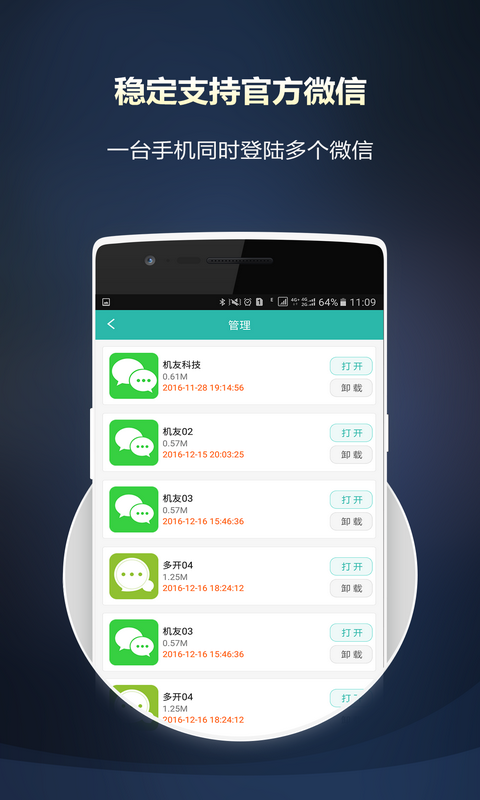 微信多开宝免费版是一款专业的微信多开神器,能够在一部手机上同时的安装多个微信,支持同时的登录多个微信,有效的管理了我们的多个微信账号,这对于有多个微信账号的小伙伴而言,是一款非常实用的微信多开辅助软件,微信多开宝免费版采用强劲的虚拟引擎,能够一键制作多个微信分身,并各个微信分身之间运行相互独立,都具有微信的相关功能,软件体积小,占用内存小,并且软件中没有任何的广告,给用户提供了一个干净的操作环境。