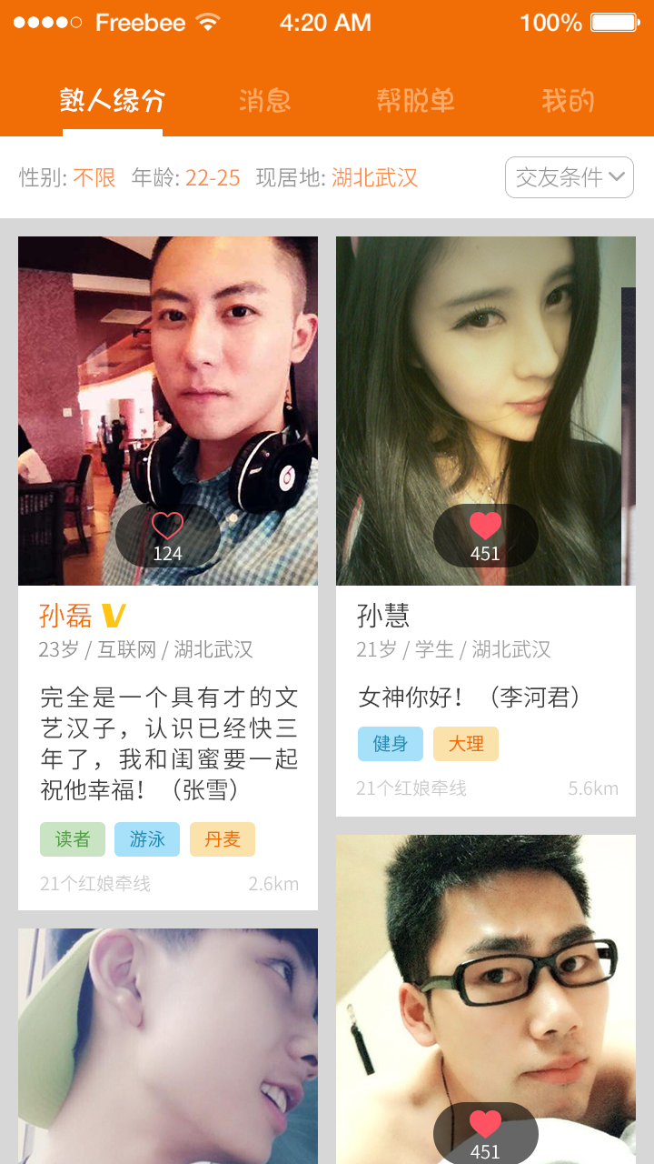 1.全新的瀑布流界面,寻找缘分更简便