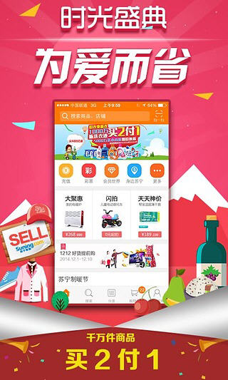 宁易购,正品网购平台!爆品大聚惠手机端专享2折起!千万件商品买二付一!S码?抢到即赚到!更有15亿红包全民抢!掌上狂欢购?就来苏宁易购客户端,体验“想购就GO”的移动购物新风尚。百万商品,低价抢购,国内外品牌旗舰店厂家直供,100%正品承诺,全国1600多家实体门店,线上下单门店体验,让您购物无忧! 苏宁易购软件特色 1.海量商品:家电、母婴、美妆、百货、数码、手机、汽车、图书、家居、服装服饰、食品、百货,随时随地想购就购! 2.促销优惠:团购、抢购、天天特价,每周促销不断,App不定时提醒! 3.本地生活:餐饮美食、酒店机票、旅游景点门票、电影、健身、K歌写真、摄影婚庆! 4.充值缴费:话费充值、彩票、游戏、电子书、水电煤缴费! 5.安全保障:货到付款、门店支付、银联、网银等多种支付方式,让您购物更安心! 苏宁易购2.6.3版本更新内容 1.新年红包派发,缤纷好礼送不停; 2.提供门店自提服务,现场体验更放心; 3.新增海外购物服务。
