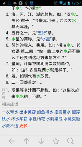 汉语字典功能特色: -提供海量汉字可供查询,收录Unicode编码基本字符集所含的20902个汉字; -根据书本汉语字典同步移植,释意严谨并且有文言例证; -按读音和按词义分类,方便快速索引,层次分明,快速查询; -每个字条还包含注音、拼音、笔画数、部外笔画、释义等信息; -支持汉字、拼音、部首、笔画数等多种搜寻方式; -无需连接网络也可以随时查询; -程序权限少,绝对不会窥探个人隐私。