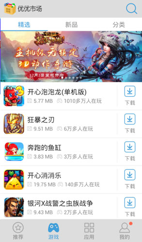 优优市场10万款免费游戏和应用任您下载,两亿用户第一选择的最智能的下载和升级平台,节省流量高达90%,采用系统加人工双重审核,安全!放心!手机安全远离病毒!人性化的设计,带来视觉和使用的双重享受,摒弃一切繁杂,拥有多种分类模块,适合不同的使用场景,让您随意享受下载的愉悦。