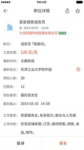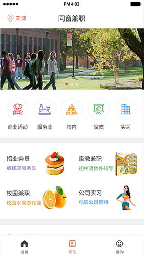 同窗兼职app功能 1.提供兼职、家教、实习工作机会 2.帮助学生与招聘方直接接触,绕开黑中介 3.工资待遇、工作要求清晰,避免找工作被坑