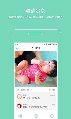 宝贝相册app功能介绍 1.支持照片分享功能 2.可邀请宝宝好友加入相册 3.可以留下对宝宝的心情寄语 4.制作照片电影一般效果 5.支持宝宝照片原图云备份功能