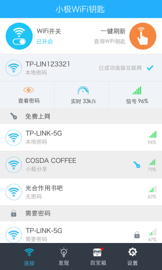 小极wifi钥匙能够自动获取附近的免费wifi热点,让用户手机能够安全的链接附近所有的免费wifi,不必再担心流量问题。