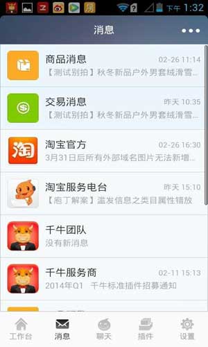 千牛是什么软件: 1.卖家工作平台:一键搜索所有店铺相关信息,方便交易,数据整理。 2.消息中心:商品消息、订单消息、退款消息、天猫早知道等公告类消息,第一时间推送到手机,让您不再错过关键信息。 3.随时随地了解自己的订单情况,抓住所有商机。 4.内设多款插件,任你选择,方便实用。