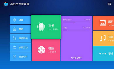 小白文件管理器软件特点: 1、能够完美的配合电视的显示规格。 2、智能分类,为你节省时间。 3、与手机和电脑建立传输连接。