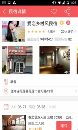 台湾民宿是一款台湾民宿在线交易咨询平台,在这里有超过3000家台湾民宿房源,支持手机定位查找附近的民宿,可随时随地查询订房信息。如果你想去体验台湾的生活,这个特别有意思哦~