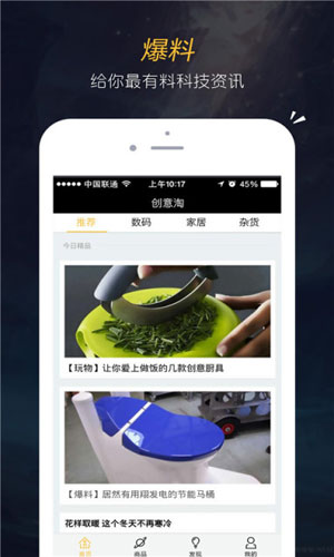 创意淘app应用特色: 1.数码,家居,电脑,手机测评,相机推荐,智能穿戴,玩物……你感兴趣的创意产品,都在这儿! 2.创意达人,数码发烧友,家居控……你的生活总有属于你特定的标签,创意淘帮你记录一切! 3.创意淘设计极简分享流程简单,满足你分享时的快感体验!