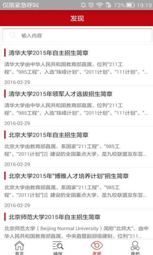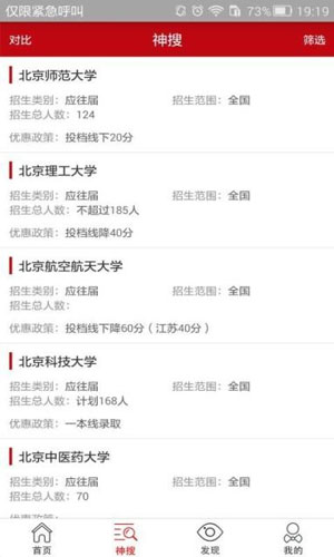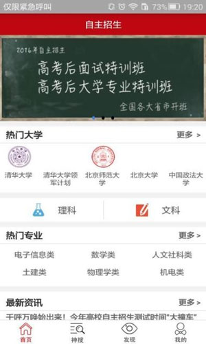 自主招生app应用特色: 1.神搜助您精确查找,包括省市、年份、学校、自招类别、学院、报名条件、优惠政策、专业大类、专业、应往届、文理科、考试科目。 2.通过对比,朋友们可以查看大学之间对比展示报名条件优惠政策等信息。 3.发现:各个大学每年简章和资讯展示。