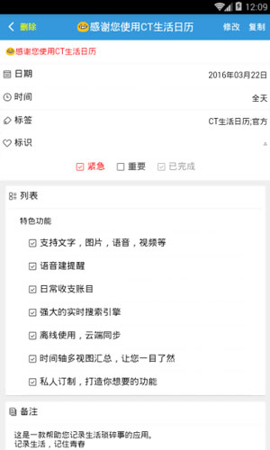 CT生活日历app应用特色: 1.CT生活日历app的语音建提醒,自己录制提醒音效。 2.CT生活日历app记录日常收支账目,清楚每笔生活开支。 3.CT生活日历app有着强大的实时搜索引擎,快速查找您要的数据。