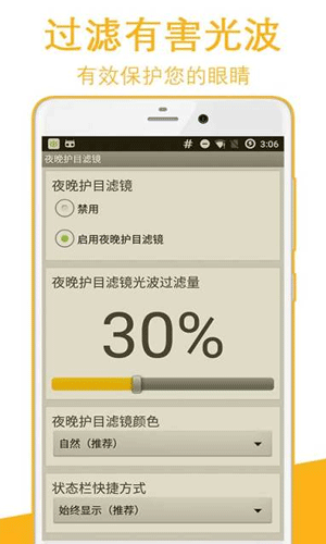 夜晚护目滤镜客户端特色: 1.夜晚护目滤镜客户端是一款绿色健康、保护眼睛的手机辅助工具。 2.在日间使用时,您可启用夜晚护目滤镜客户端来过滤减少屏幕的有害光波,保护您的眼睛。 3.在夜间使用时,您可调整滤镜颜色,把夜晚护目滤镜客户端的滤镜改为“黑色”来进一步降低屏幕亮度,使屏幕变得更暗,不刺眼,大大降低夜间玩机对眼睛的损害。