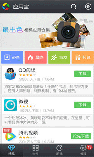 2014应用宝版本特色 1、新增安装包管理 2、软件更新优化,忽略更新更加方便 3、下载列表优化,可以看到下载进度,管理下载任务更加方便 4、全新上线礼包中心,下载即可得各类应用特权与礼包 5、微信和手机QQ游戏中心的所有游戏将在应用宝发布 6、增加帐号体系,支持QQ/微信两种帐号 7、增加收藏功能 8、增加分享功能,可将应用分享到QQ、Qzone和微信
