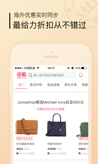 精选海外直购,全球爆款低价特卖,海淘时尚达人必备扫货神器,为用户品质保证-通过海狐买到的商品,是经过国外更严格的审核标准生产,让您体验简单、舒心、有趣的一站式代购旅程!