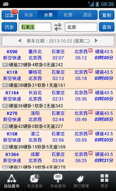 盛名列车时刻表是一款查询全国铁路时刻表的共享软件,无论你在上海、北京、广州还是杭州,只要使用盛名列车时刻表,就能轻松的为你的出行作出安排。 主要特色 1.携带更方便:手机版程序弥补了PC版程序不宜随身携带的不足,使随身携带成为可能; 2.费用更节省:软件的运行不需要网络支持,无需GPRS费用; 3.信息更完整:业内唯一一款可以准确计算票价的时刻表软件; 4.更新更及时:数据更新与PC版盛名列车时刻表同步; 5.操作更简单:操作方式符合大多数人的操作习惯; 6.界面更美观:软件界面非常美观。