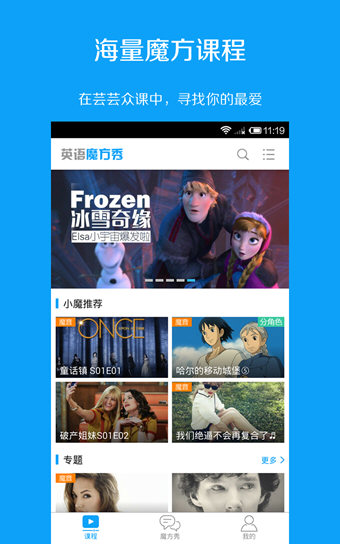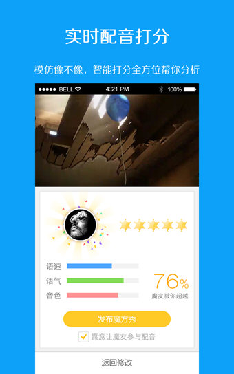 英语魔方秀是一款看电影学英语的学习应用。产品通过对海量电影视频数据的分析,精选最适合学习的视频片段组成魔方课程,帮助用户通过对电影、美剧、演讲、歌曲片段等视频原声的跟读模仿,模仿最纯正的语音练就地道英语口语,学习最实用的英语。看电影,追美剧,玩英语! 主要功能 1、海量魔方课程,在芸芸众课中,寻找你的最爱! 2、扮演喜爱的角色,逐句模仿,看透美剧很简单! 3、轻松生成一段自己的魔方秀作品,广大魔友可点赞拍砖,更有机会上排行榜呦! 更新内容 1.私信功能,欧耶,终于能跟心仪的男神女神私聊勾搭喽! 2.打分功能,分数不能证明一切,但没有分数啥都证明不了! 3.插耳机时,录音过程中播放配乐,让录歌更有赶脚! 4.优化应用稳定性,解决部分机型闪退的bug!
