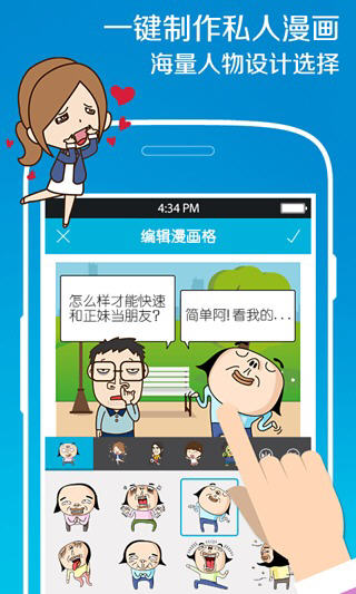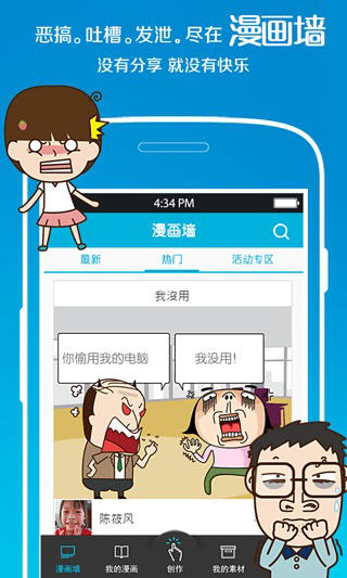 手滑漫画,用最有趣的方式,打开你手机中存储的人物图片。生活就是创作最好的素材,你可以根据身边的故事,随时随地着手制作,人物设计、对话内容,全凭你定,此时,你就是导演! 手滑漫画软件特色 1.每天为你更新与生活息息相关的各种经典对话; 2.自主创作属于你的日常漫画,人人都是漫画家; 3.将手机中的人物图片变成一个个生动有趣的漫画角色; 4.制作好的漫画,可一键分享,让好友都来点评。 手滑漫画2.0.2版本更新内容 1.【新增】更多主题模板; 2.【优化】对字体大小及颜色的自定义。