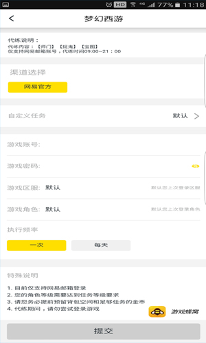1、安装好"游戏蜂窝",注册并登录软件; 2、选择底部栏目"一键日常",进入手游代练界面; 3、选择游戏,根据您的代练目标"设置"相应的任务功能,还可自定义代练需求; 4、填写代练的游戏账号及密码,设置好之后点击"提交"即可进入游戏代练。