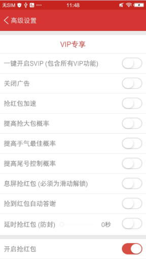 快乐抢红包vip修改版是一款全免费的永久不封号的微信自动抢红包神器,快乐抢红包vip修改版它的最大的特点在于修改了vip会员特权,具有智能的过滤红包功能,可以完美的控制红包的位数,完美的避开小包,想抢哪个自己作主,让你一秒登上抢红包的排行榜。同时还能够有效的避开微信和qq的各种封堵、拦截,支持红包自动秒抢,解放双手快抢红包,智能的省电加速模式,提高抢红包概率,是我们手机抢红包的必备神器。