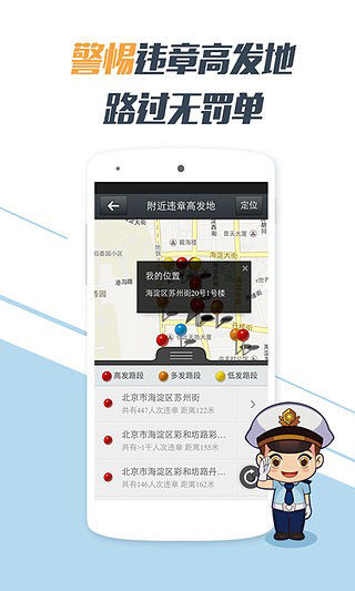 车辆违章克星,8000万车友出行必备!精选各城市违章高发路段,地图提醒附近违章易发路段,倡导广大车主朋友遵守交通安全规则,从源头上有效降低违章的发生。支持全国300多城市违章查询服务,方便您随时随地查询车辆违章情况! 功能介绍 1.【违章查询】交管局违章记录实时查询,支持全国30省300城市; 2.【违章详情】违章路段、时间、类别,对应的罚款、扣分、处理地址等信息; 3.【天气预报】预报6天内的天气信息,雨雪风霜、温度、洗车指数了然于胸; 4.【异地违章】完美支持单车查询、多车查询,一辆车可添加多达5个城市; 5.【全城违章排行】本市违章高发路段、多发路段,提醒路过司机朋友注意; 6.【附近违章高发地】结合地图定位附近易发违章路段,警示并避免违章发生。 更新内容 1.提升地图精度,拖动坐标流畅查看附近违章易发路段; 2.升级西安、襄阳、扬州等热门旅游城市查询服务; 3.发布120多座城市年度违章高发路段排行榜; 4.云端登录、同步违章数据、分享UI优化,使用更随心; 5.增加选车版块,汽车报价、配置、车型图等内容。