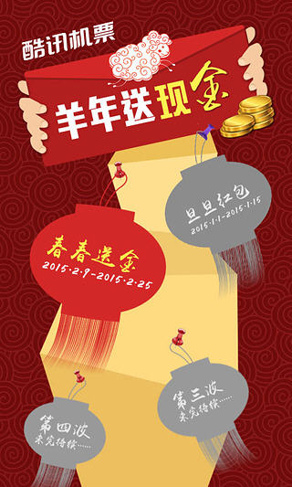 酷讯机票是一款提供给广大用户超低机票的手机APP,在这里,你不仅可以订购机票,还能订酒店和火车票。网上快捷支付、刷卡、现金、信用卡等多种支付方式,充分满足你的消费模式。 酷讯机票软件特色 1.春运期间(即2.9—2.25),累积使用此软件购得4张+机票的用户,可报名参加活动,并获得金额不等的现金大奖哦; 2.特价机票/酒店,全网比价,为你找到物美价廉的机票/酒店; 3.多种付款方式,操作简单,安全可靠; 4.方便快捷的退票改签功能,极力省时,从此刻做起; 5.航班信息,快捷查询,一步到位。 酷讯机票5.2.5版本更新内容 1.【新增】航班停靠城市显示; 2.【修复】上一版本的错误。