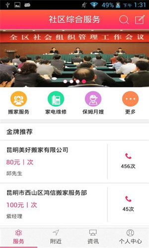 社区综合服务app有什么用? 1.提供家政、外卖点餐、快递、订车票、交通信息等社区服务 2.推送本地以及社区相关资讯,让你了解你关心的事情 3.加入个人中心功能,可以发布需求、联系客服等