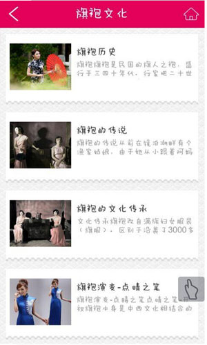 旗袍app为用户带来旗袍手机版下载安装资源。这是一款收录了旗袍文化、旗袍品牌、旗袍工艺等信息的手机APP。此外旗袍app还介绍了有关旗袍的传奇人物,更有达人的旗袍穿搭方法供你借鉴。喜欢旗袍app的女性,赶快下载吧。