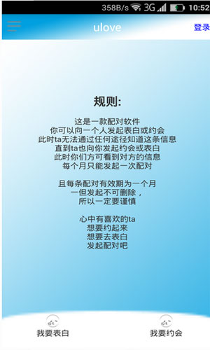 uloveapp为用户带来安卓版ulove软件下载安装资源。这是一款爱情配对软件,专门为彼此喜欢又没有互相表白的青年们开发。在uloveapp,你可以向你喜欢的人发起表白或约会哦。喜欢uloveapp的用户,赶快下载,邂逅你的TA吧。