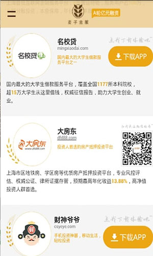 麦子金服软件特色: 1.麦子金服为用户带拉力一款安全靠谱的金融理财软件。 2.麦子金服app是一个移动互联网金融服务平台,麦子金服app以优质资产为核心。 3.麦子金服为个人和企业提供包括财富管理、股权投资、投融资咨询等综合资产管理服务。