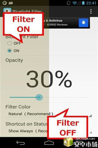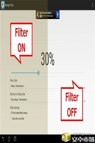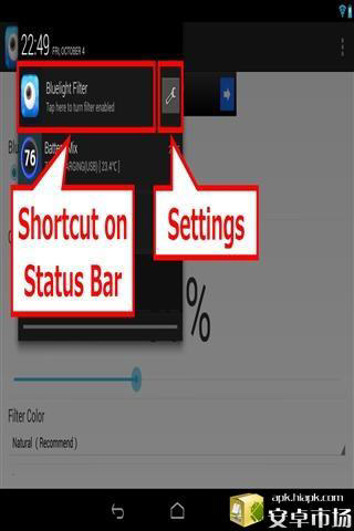 蓝色光波过滤器软件特点: 1、轻轻松松解决眼睛疲劳,快捷方便简单。 2、自动调节屏幕颜色和自然色彩一样,让你阅读起来清晰自然; 3、一键开关,操作方便; 4、自定义5个过滤器的颜色。