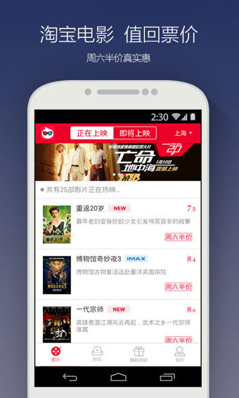 淘宝电影主要功能 1、电影推送,好莱坞大片想看就看; 2、最全的影院资源,支持附近影院在线选座; 3、周六购票半价,还有优惠券、9.9抢票等超值活动; 4、最新电影预告和影评,不错过每一部精彩影片。