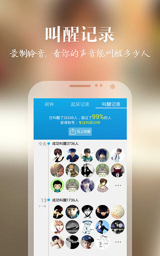 女神叫你起床,国内首款真人美女闹钟软件,让起床不再是煎熬。同时,它还是一款移动交友软件,与附近陌生人一起,体验不一样的叫醒服务,快来与你心中的ta一起从梦中醒来吧! 女神叫你起床软件特色 1.自定义录制别样铃声,你的声音能叫醒多少人; 2.“附近”搜索,快来叫醒你身边的小伙伴吧; 3.“我的”个人中心,随时关注女神最新动态; 4.“发现”频道,为你推荐网上备受追捧的男神女神。 女神叫你起床2.1.5版本更新内容 -【优化】页面运行加载速度,提高系统稳定性