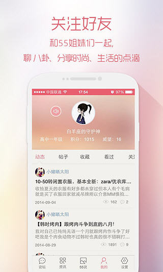 55BBS,实力打造女性消费者的天堂。出行购物、美容护肤,享受全新网购服务。用八卦的手段,为你汇聚全球品牌时尚荟萃。不论你是娱乐、旅行,还是衣食住行,我们旨为打造最具魅力的你! 55BBS软件特色 1.全球新品动态发布,为你在线剖析时尚的含义; 2.从穿衣打扮到衣食住行,你想要的,这儿都有; 3.下午茶新体验,扎堆交友,八卦聊天,随你玩乐; 4.在众人面前尽情展示时尚、个性、魅力的自己吧! 55BBS2.0.0版本更新内容 1.【优化】发帖功能,及好友动态展示; 2.【修复】已知bug。