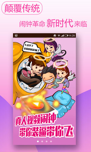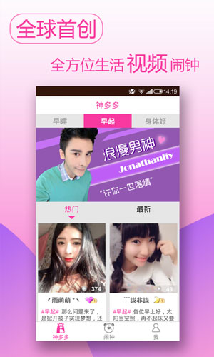 神多多闹钟软件特点: 1、真人视频,贴身提醒。 2、自定义名字设置叫醒。 3、绝对帮你摆脱困难户。 4、创新的模式,新一代闹铃神器。