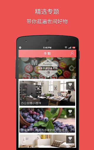 半糖,用简单而富有的创意的小物品,打造精致优雅的生活方式。太苦、太甜,都只会让人走向两个极端世界,从而迷失自己的方向。而半糖主义,各取所需,站在中间,看尽人间百媚千姿! 半糖主义功能 -每日为你推荐更多生活实用品 -对创意小饰品,一键加收藏 -通过半糖,体验另一种生活方式 半糖2.3版本更新内容 1.【新增】用户可随意订阅喜爱的内容; 2.【优化】界面显示及用户体验; 3.【修复】上一版本的bug。