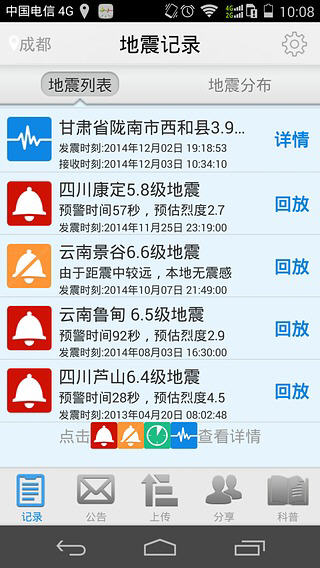 地震预警,为你实时预测地震,也许只有几秒钟或几十秒钟的时间,但这样,却可能让你脱离危险。当地震发生后,用户也可通过地震预警上传你所在区域的灾情信息,以获取第一时间的救援。 地震预警软件特色 -对用户自身有影响的地震发出警报 -覆盖全国的地震监测网,实时播报地震 -发生地震后,上报灾情,以获及时救援 -地震发生后,提供救助等基本措施