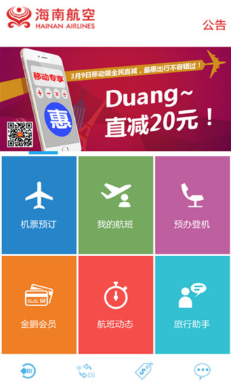 海南航空手机客户端帮助你更加轻松的处理海南航空票务,低价折扣,里程换票,航班动态各种贴心服务让你的旅行更加方便。