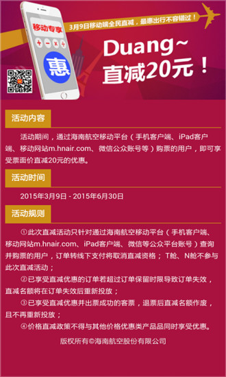 海南航空手机客户端软件特色: 手机独享低价折扣优惠; 提前预办登机相关手续; 航班最新动态随时查询; 飞行里程直接换取机票;