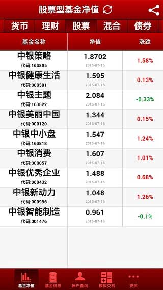 中银基金app怎么样: 1、快速查询中银基金公司旗下基金最新净值; 2、查询基金基本信息,投资明细,产品亮点,基金净值走势和历史净值信息; 3、提供用户基金持仓信息、活期宝查询、分红查询、交易查询、理财产品到期日等功能; 4、提供基金簿记和模拟交易功能。