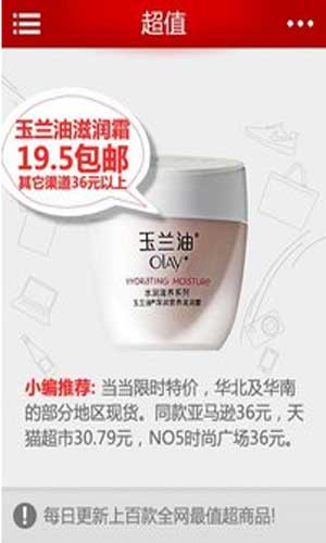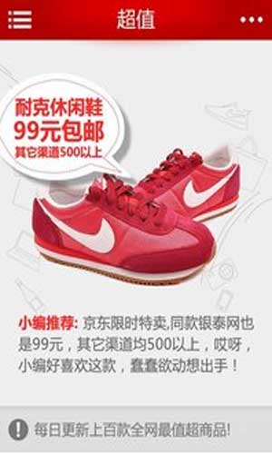 超值app特色: 1.海飞丝10元!妮维雅10元。 2.耐克跑鞋99元!哥伦比亚冲锋衣299元。 3.乐扣乐扣组合装99元!美的电饭煲99元。 4.限时特卖,价格随时改变!我们只推荐品质超值商品。